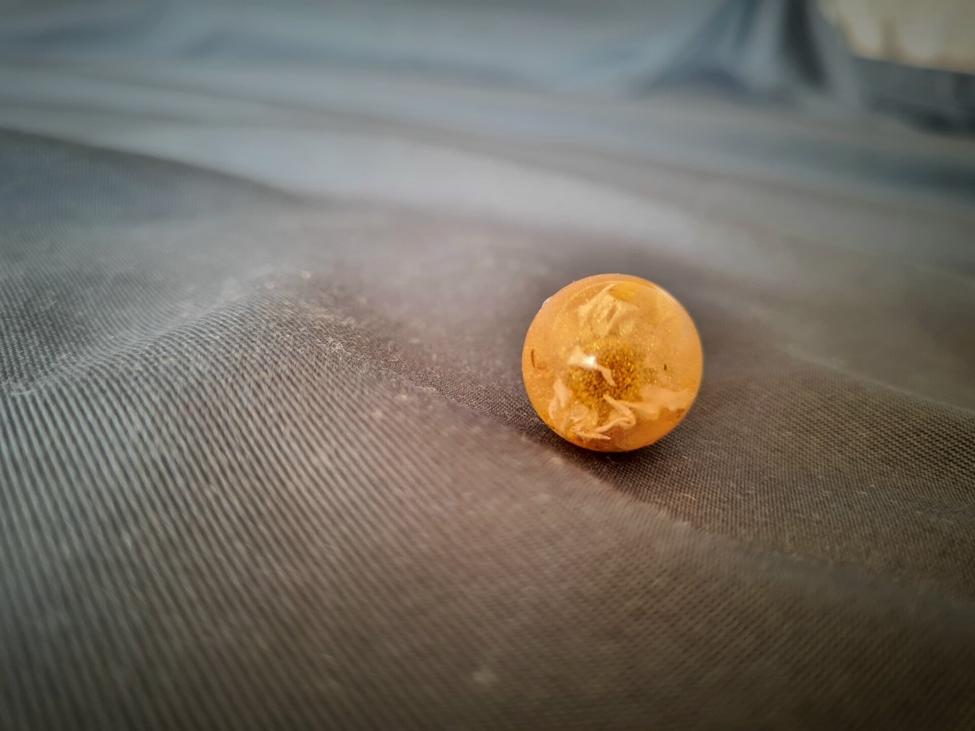 Epoxidkugel mit Heilsteinen, Gebetsfäden und Kräutern.